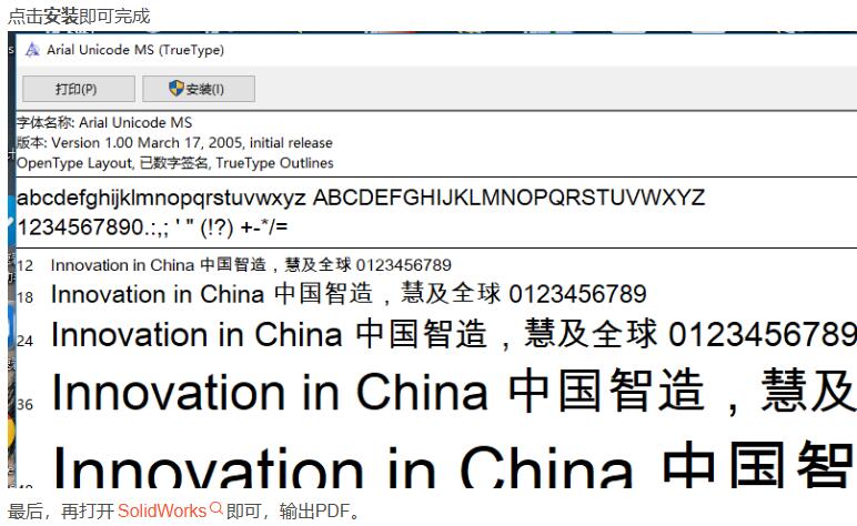 SolidWorks工程图导出PDF时出现“Arial Unicode MS”字体不存在时,解决方案