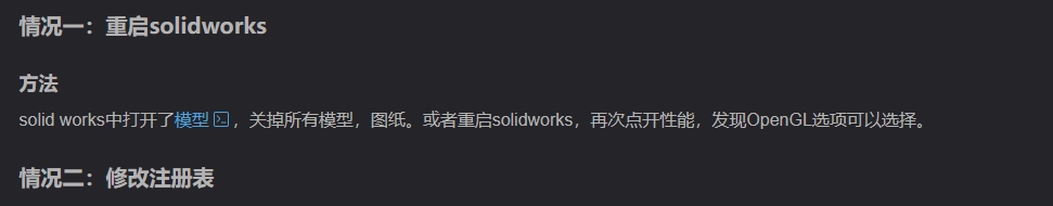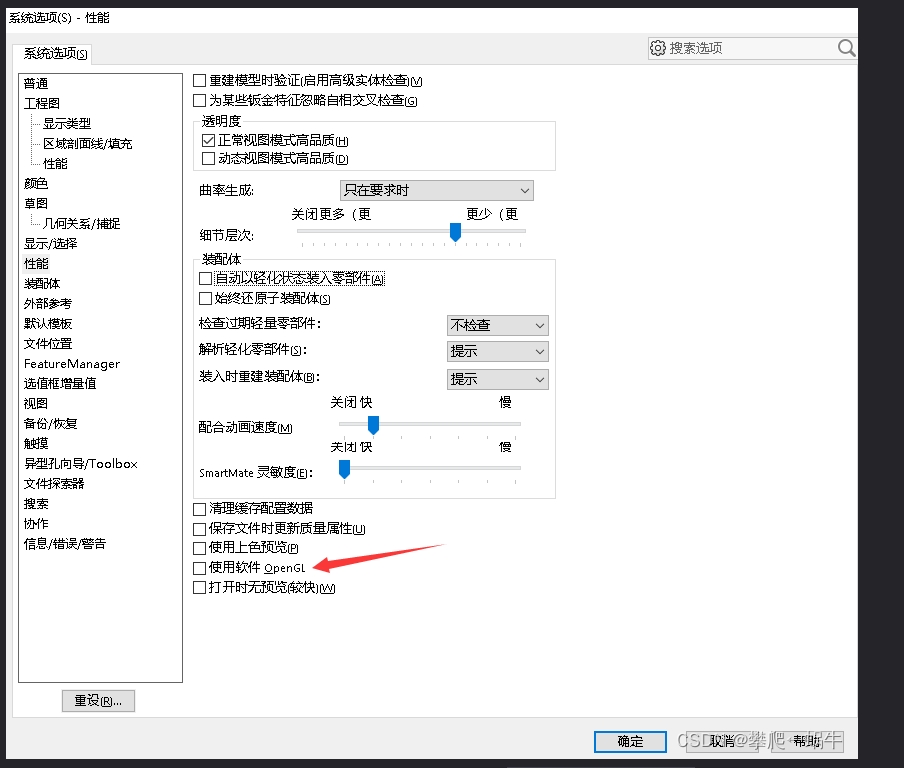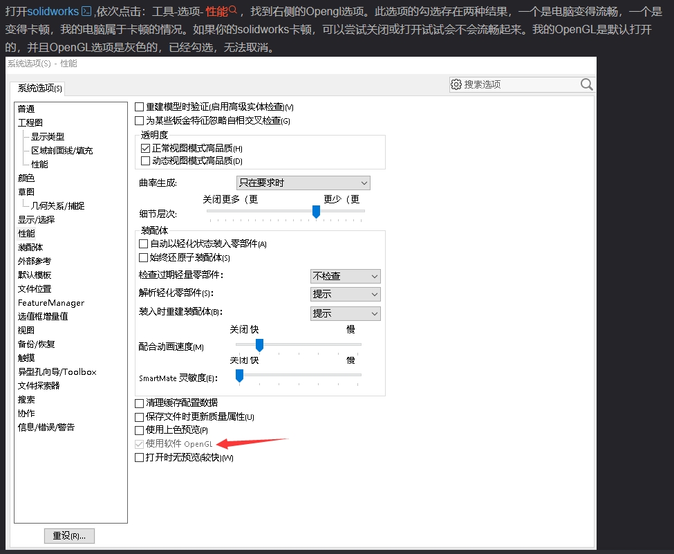 4. 设置好后重新启动solidworks即可发现性能中openGL已可以勾选或取消。