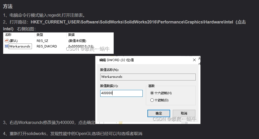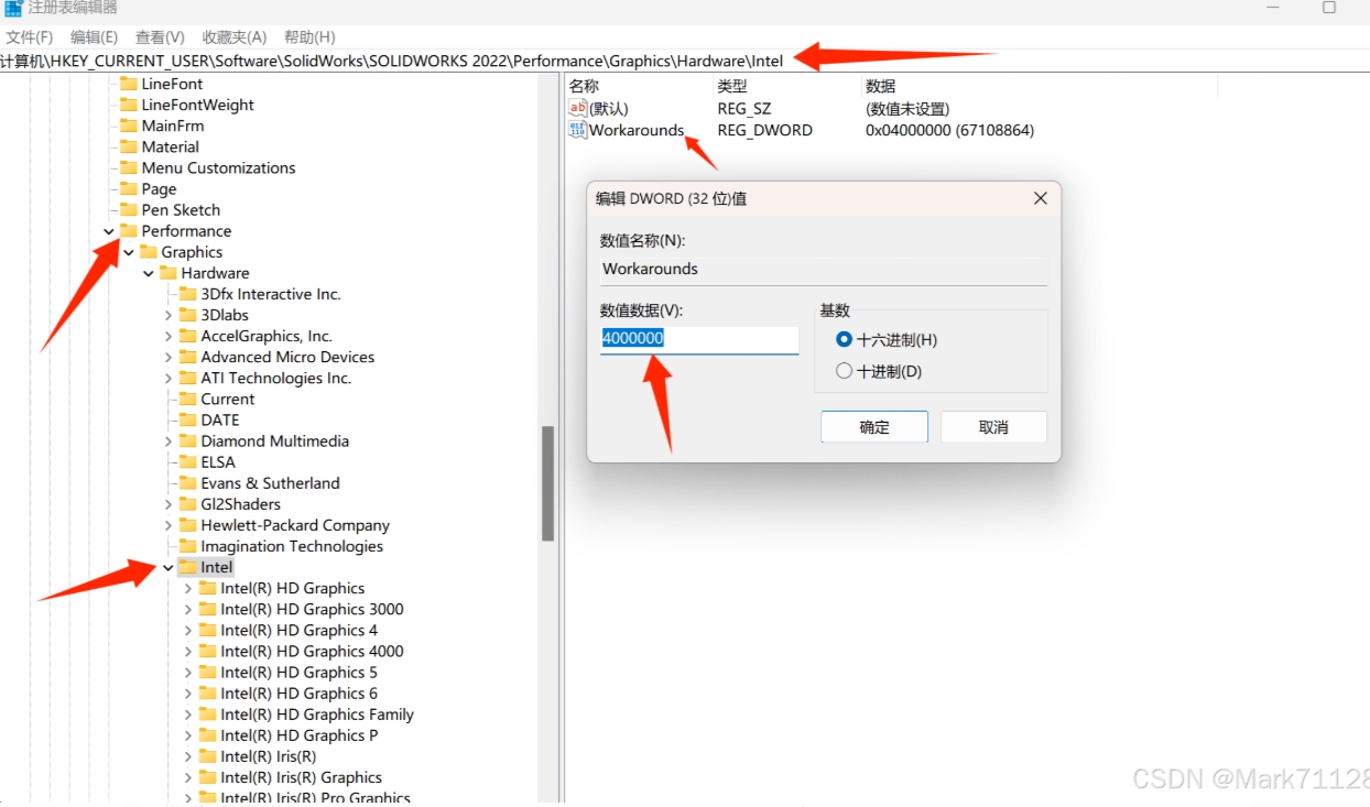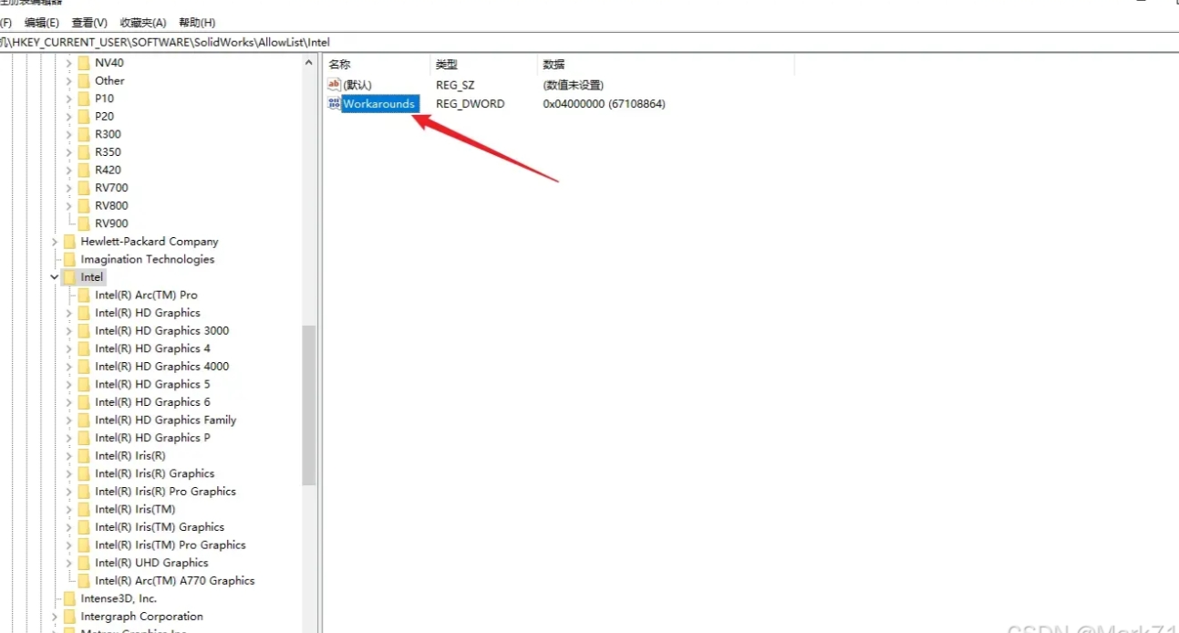 2.依次导航至以下路径:HKEY_CURRENT_USER\Software\SolidWorks\SolidWorks 20xx\Performance\Graphics\Hardware\Intel (其中“20xx”代表您安装的SolidWorks版本号)。点击intel,双击Workarounds,修改值为4000000。再打开sw,发现性能中openGL已可以勾选