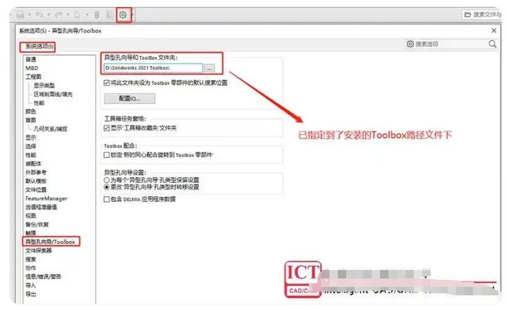 当我们打开SOLIDWORKS,找到“系统选项”-“异形孔向导/Toolbox”-“异形孔向导和Toolbox文件夹”,下方已经正确指定到了安装的Toolbox路径文件夹下;