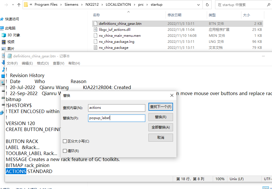 3.进入到编辑下,然后替换,在查找一栏填Actions,替换为:POPUP_LABEL;